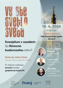 On Friday, April 10, 2026, a discussion meeting on the topic of church work among Roma communities took place in the hall of the Evanjelický spolok in Banská Bystrica. The event was moderated by Adam Takáč from the daily Postoj, and Juraj Majo participated on behalf of the Institute of Ethnology and Social Anthropology of the Slovak Academy of Sciences. He was joined by Salesian sister Zuzana Saloňová, who works in Luník IX, and Lutheran pastor Ľuboslav Beňo, who serves in Rankovce.